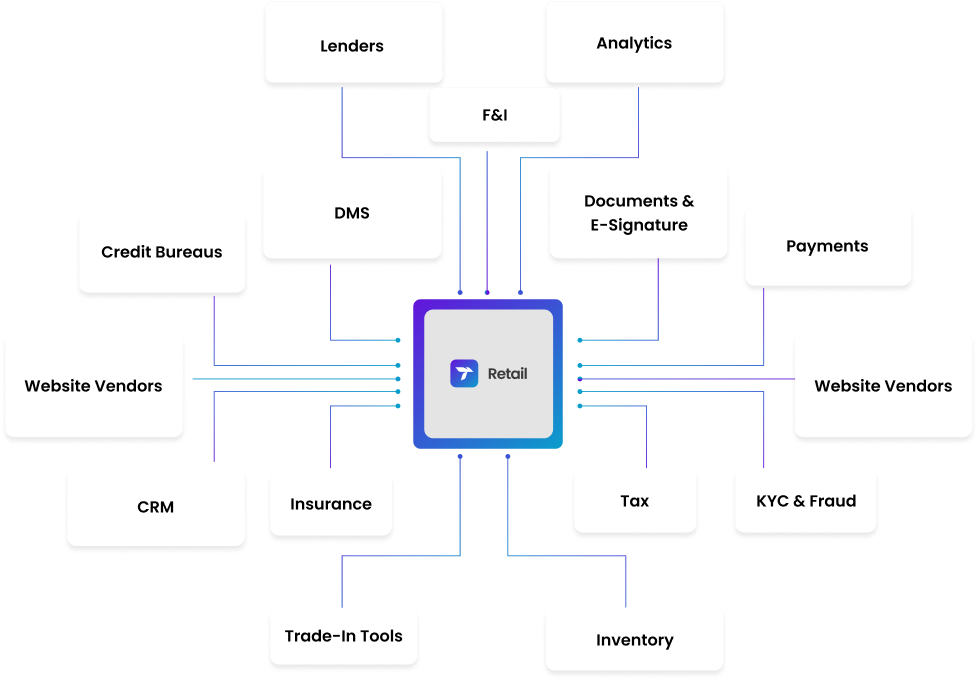 Works with lenders, DMS and CRM platforms, credit bureaus, F&I tools, website providers, and other vendors.
